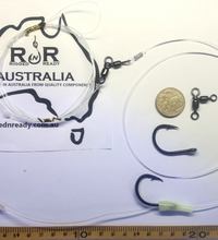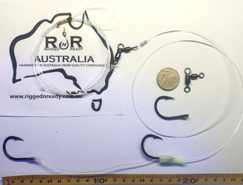 These double live bait hook rigs work great with live Slimies, Yakkas, Mullet, Squid. They will also work well with whole dead Squid, Pillys and large strip baits. The first hook has a small lumo chaffe protector to keep the rig running true in the current and also to adds a slight bit of attraction. (this hook goes through the head area of the bait)