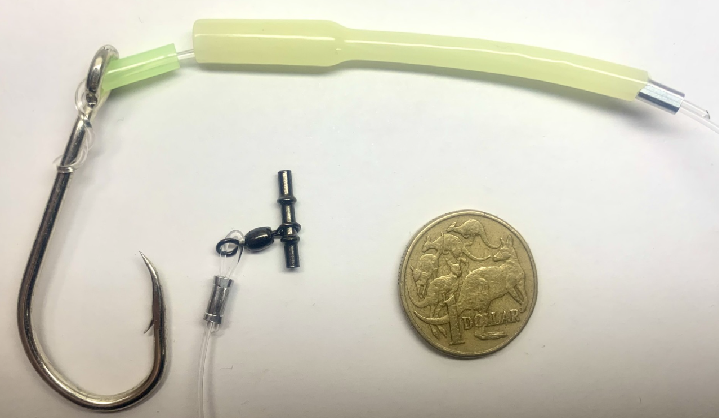 EZ baiter hooks have been used by the commercial sector for many years and have proved to be a worthy hook. A combination of circle hook and long shank. The secret with this hook is the line has to go thru the barbed hook side of the eye thus angling the hook lightly against the leader. This will now allow for a near perfect hook up rate, exactly how I have rigged them. They are razor sharp hooks and will self-set into the fishes mouth. They are a commercial grade hook and extremely tough and durable. Set and Forget rig, these hooks will self set.