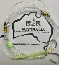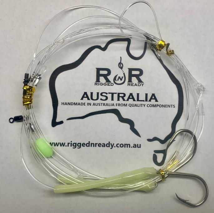 A rig designed for medium depth waters 60-200m. Suitable for most bottom demersal species including but not limited to Snappers, Emperors, Trumpeter, any bottom fish really. You can use this Deep Dropping aswell, The 200lb mono and hooks will easily take on Deep Drop species including Flametails, Blue Eye Trevalla etc. If you want more than 2 Hooks join it to another rig.