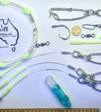 This rig is made from commercial grade 350lb Fujiyama fluorocarbon leaders that will fluoresce and attract fish in the remaining UV light in the deep and in combination with our Deep Drop Blue light included with this rig.  The backbone comprises of 350lb Fujiyama mono with spacers, nylon protector tube and lumo beads. The nylon tube mono protectors also enable the shark clip to rotate stopping any twist ups on deployment and retrieval.