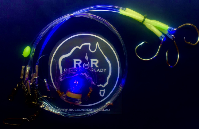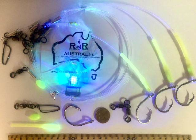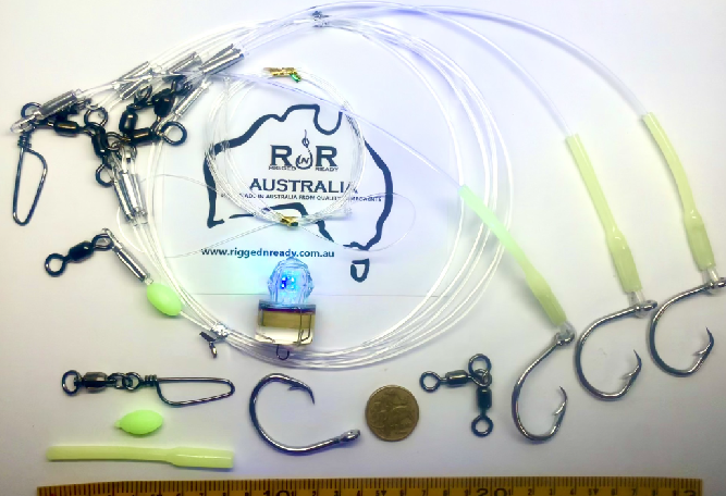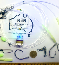 These rigs will not twist up on deployment and thus aid in bait presentation. High quality 3-way Crane Swivels will allow for fast tangle free deployment.  All hooks spacings are 1 mtr apart, All of my rigs are made to enable to connection to another rig via coast lock snaps and swivels. (all inbuilt) This enables 3-6-9 rig combos. (please check your states rules). Rigs are made to maintain 1 mtr separation between hooks no matter how many rigs and what combos you connect supplied by Rigged N Ready.