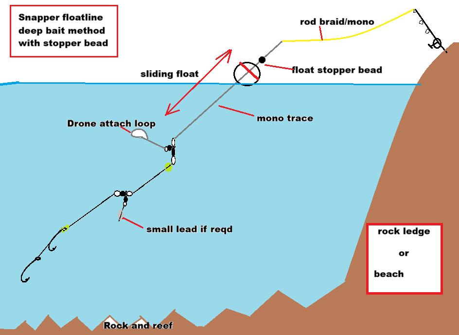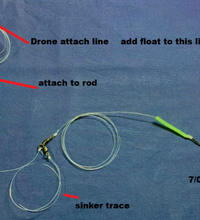 1- If you want bait near surface for retrieval /troll method in the upper 2m going over reef / sand / weed put a LARGER float on drone connection loop that will stay at surface with a small ball sinker on the short sinker trace to keep rig down a bit.