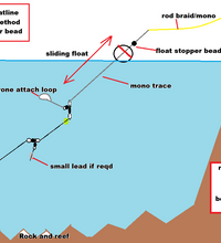 Something else you can do with this rig is a slow retrieval method where you drop the bait well out and then retrieve at 1 -2 km hr. It can be surface trolled over reefs and weed or bottom trolled over sand with live baits like mullet, whiting, yakkas etc. You can use good quality also dead bait hooked up so it swims strait and dosnt spin. You will need to put different floats and leads on for these methods below. ( Also see rig diagrams.)
