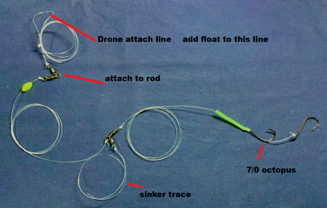 A versatile rig designed for drone fishing off the bottom. You can float this in reefy weedy areas where otherwise you would be snagged. It is an adaptation of my float line snapper rigs. Ideally deployed by drone from the beach toward reefy areas, or from the rocks and cliffs also fishing reefy areas. (This is not a deploy and leave on the bottom rig. It needs to be either floated with a float or slow retrieved / trolled also requiring floats.) - Floats not included – The size float you need will depend on how you wish to fish this rig.