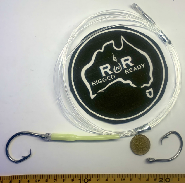 A medium to heavy game and pelagic trace. Quality 11/0 SS circle hook 39950 on 4 mtr of 350lb Japanese Fujiyama Flurocarbon. Near invisible in water. (IGFA legal for 10kg class) Each connection point is bench crimped. Nylon tube protectors on joining loops with a lumo chaffe protector above the hook. (This line protection  gear is whats used on commercial longline vessels so you know it is built for the task).