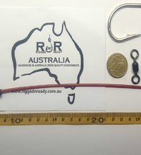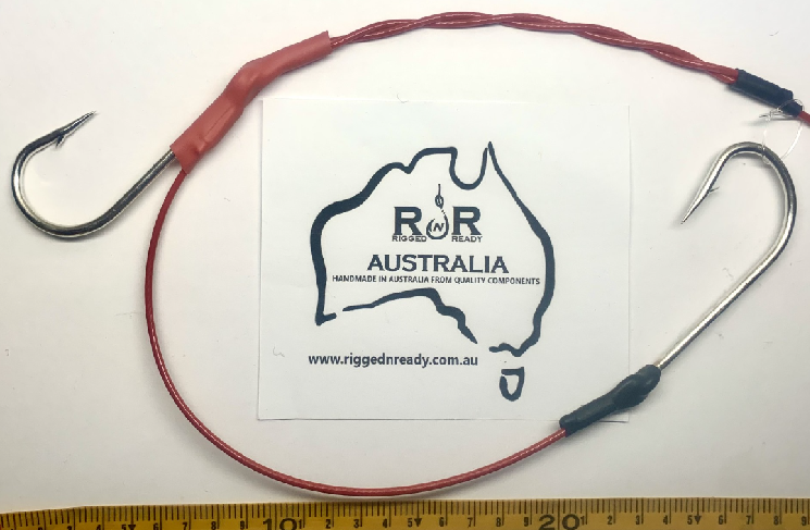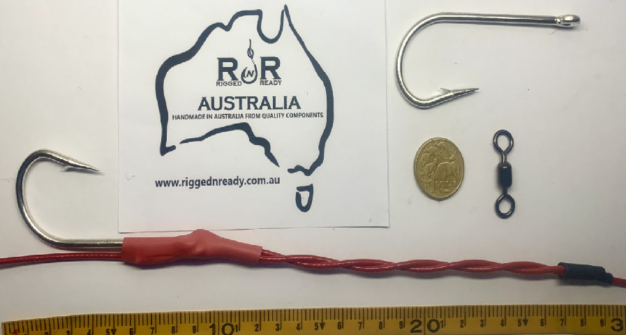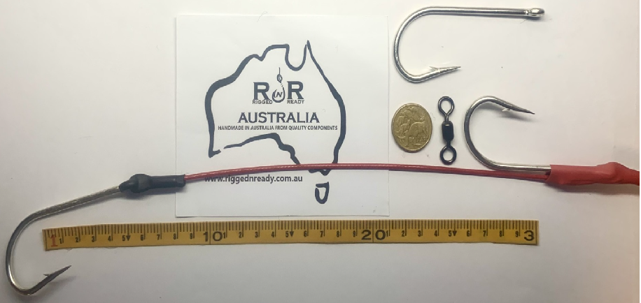 Made from nylon coated Stainless steel wire, easy to grip when tracing sharks. Hooks have been heat shrunk to keep them in an ideal position for the best hook up rates. Commercial Grade hooks and hardware used. All wire crimps have been heat shrunk to minimise any chance of mono damage and cut offs.