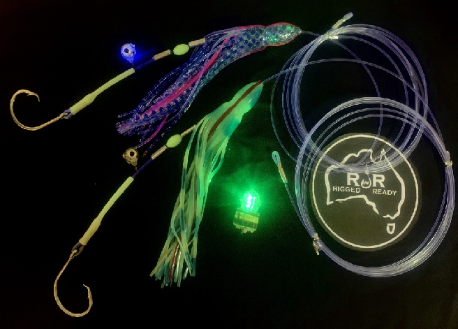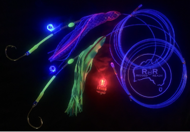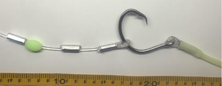 This rig has been designed to be used with Medium whole Squid baits for Swordfish. Also for Strip/belly flap baits.  I have built into this rig 2 x adjustable sliding/spacing crimps combined with a lumo bead to be positioned in the top of the squid hood. This allows for interchanging and ease of rigging different size baits without having to cut the rig or re crimp spacers etc.