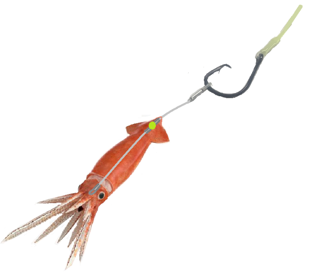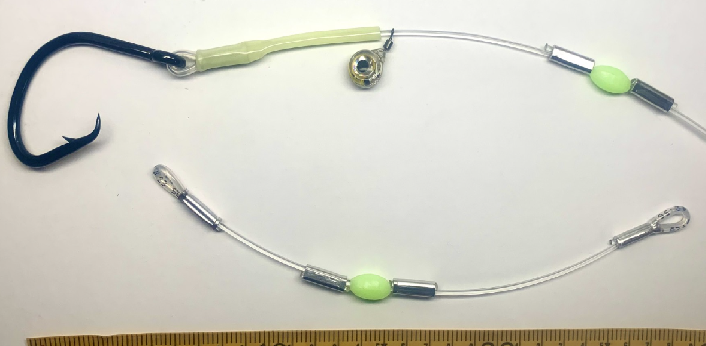 This rig has been designed to be used with large whole Squid baits for Swordfish. I have built into this rig 2 x adjustable sliding/spacing crimps combined with a lumo bead to be positioned in the top of the squid hood. This allows for interchanging and ease of rigging different size baits without having to cut the rig or re crimp spacers etc. By using these sliding spacer crimps and bead all the weight/ drag is taken on the tip of the squid hood. This keeps the squid swimming straight, and well-presented during deployment and whilst drifting in the current.