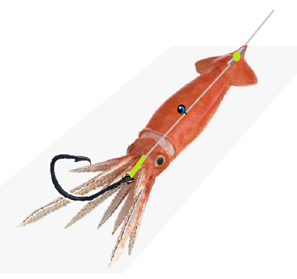 1- lay the rig alongside the squid that has had beak removed and head sewn to mantle, slide the spacer crimps and bead (tight but adjustable, may need slight tightening with crimping pliers) to a position so the hook will be positioned in the squid head/legs.